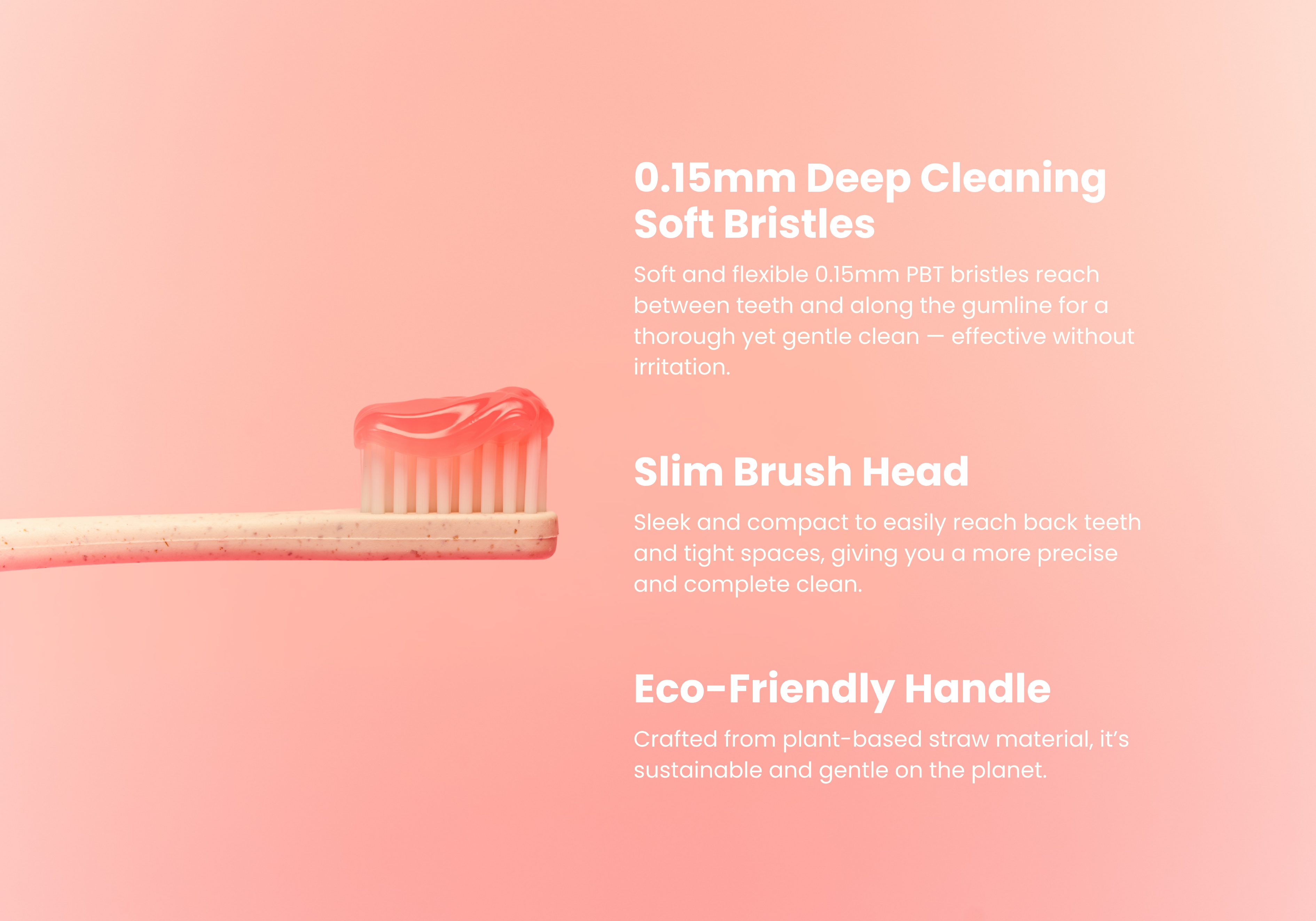 A simple, everyday toothbrush designed for a gentle yet effective clean. Made with soft 0.15mm PBT bristles that reach between teeth comfortably, it keeps your brushing smooth, fresh, and effortless — all in a sleek, lightweight design that feels good in your hand.